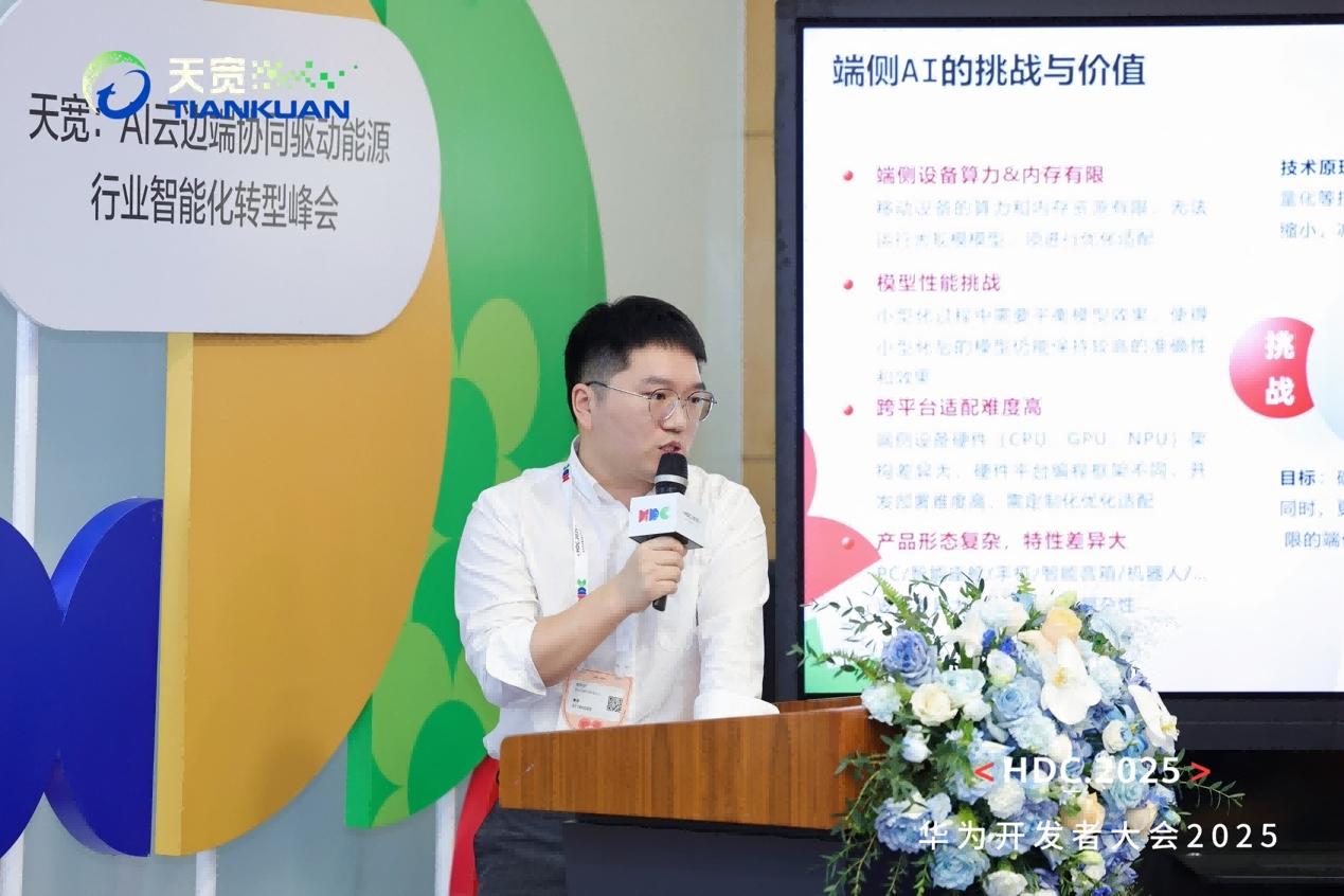 隨著AI能力從中心向邊緣下沉,端側(cè)智能化成為不可逆轉(zhuǎn)的趨勢(shì)。天寬CTO龔徐建以《基于鴻蒙的端側(cè)AI解決方案》為題,詳細(xì)介紹了公司在輕量模型設(shè)計(jì)與推理框架構(gòu)建上的核心能力。該方案已與鴻蒙系統(tǒng)深度協(xié)同,在手機(jī)、平板等設(shè)備中實(shí)現(xiàn)“本地智能”部署,極大提升了AI在端側(cè)的響應(yīng)效率與部署靈活性。