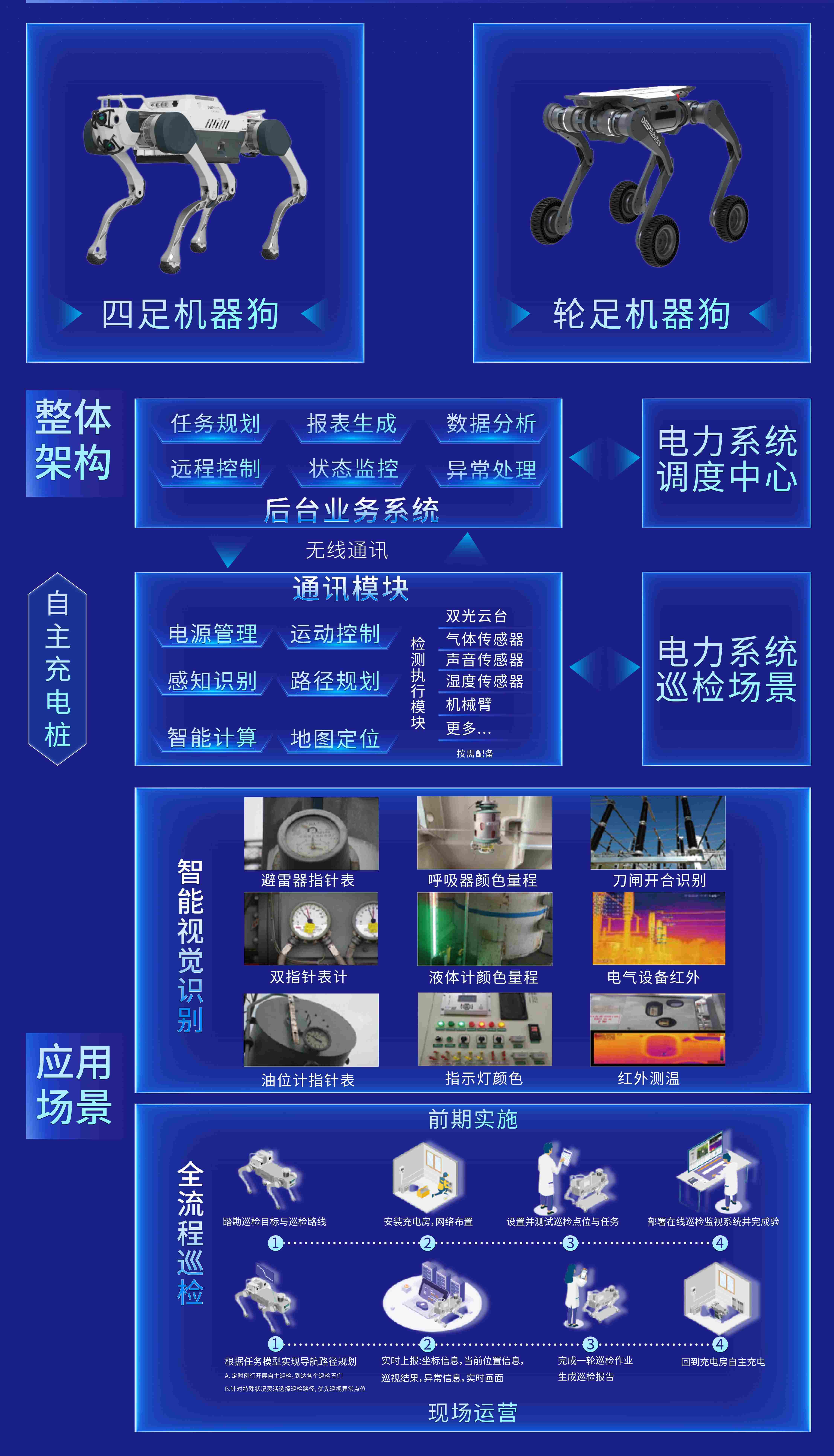 天寬精心打造的智能巡檢解決方案集成巡檢機(jī)器狗、專用監(jiān)測儀器/傳感器、自動(dòng)充電系統(tǒng)與智能管理系統(tǒng)。憑借AI視覺識(shí)別、IoT感知及機(jī)器狗協(xié)作的深度融合,該方案可實(shí)現(xiàn)基于路徑規(guī)劃和地圖定位導(dǎo)航的全自主巡查,涵蓋各類表計(jì)識(shí)別、設(shè)備工況監(jiān)測、局放檢測、溫濕度監(jiān)測、紅外測溫、氣體監(jiān)測、振動(dòng)監(jiān)測等多項(xiàng)指標(biāo)監(jiān)測,可覆蓋超95%地形場景,定位精度誤差小于3厘米,巡檢識(shí)別準(zhǔn)確率高達(dá)95%,加速隱患識(shí)別與決策優(yōu)化,助力電力巡檢向精準(zhǔn)化、智能化升級。